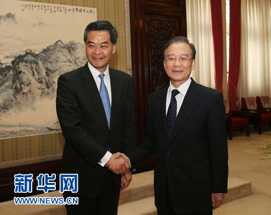 ???? 12月21日,中國國務(wù)院總理溫家寶在北京中南海會(huì)見來京述職的香港特別行政區(qū)行政長官梁振英。 新華社記者 劉衛(wèi)兵 攝