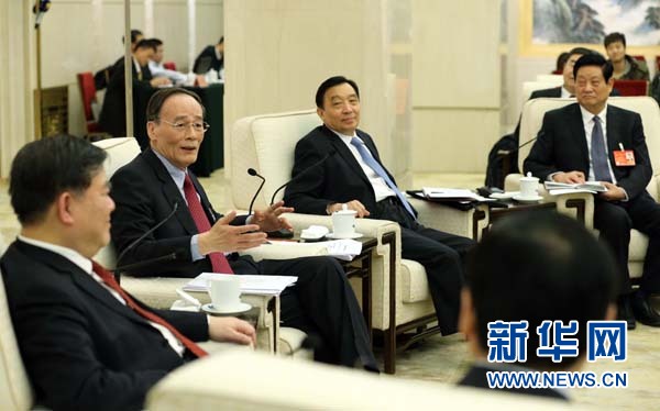 ??? 新華網(wǎng)北京3月9日電 中共中央政治局常委、中央紀(jì)委書記王岐山9日下午在十二屆全國人大二次會議陜西代表團參加審議。