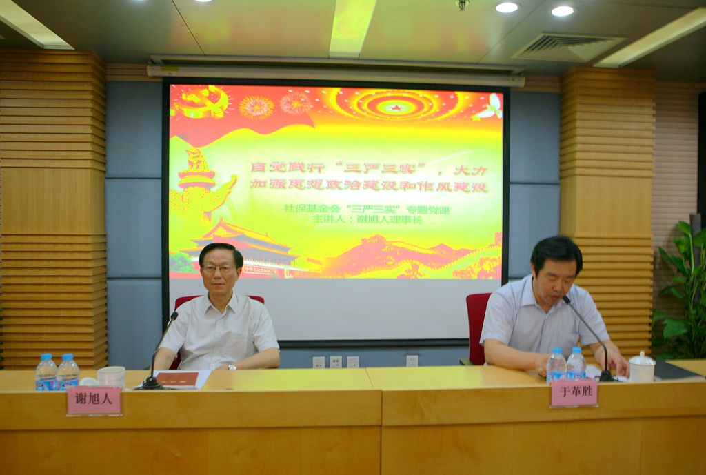 5月25日下午,全國(guó)社會(huì)保障基金理事會(huì)謝旭人理事長(zhǎng)為全體干部職工講授了題為“自覺踐行三嚴(yán)三實(shí),大力加強(qiáng)思想政治建設(shè)和作風(fēng)建設(shè)”的專題黨課,同時(shí)對(duì)開展“三嚴(yán)三實(shí)”專題教育進(jìn)行了動(dòng)員。于革勝副理事長(zhǎng)主持會(huì)議,中央組織部干部四局張晨光同志應(yīng)邀參加。