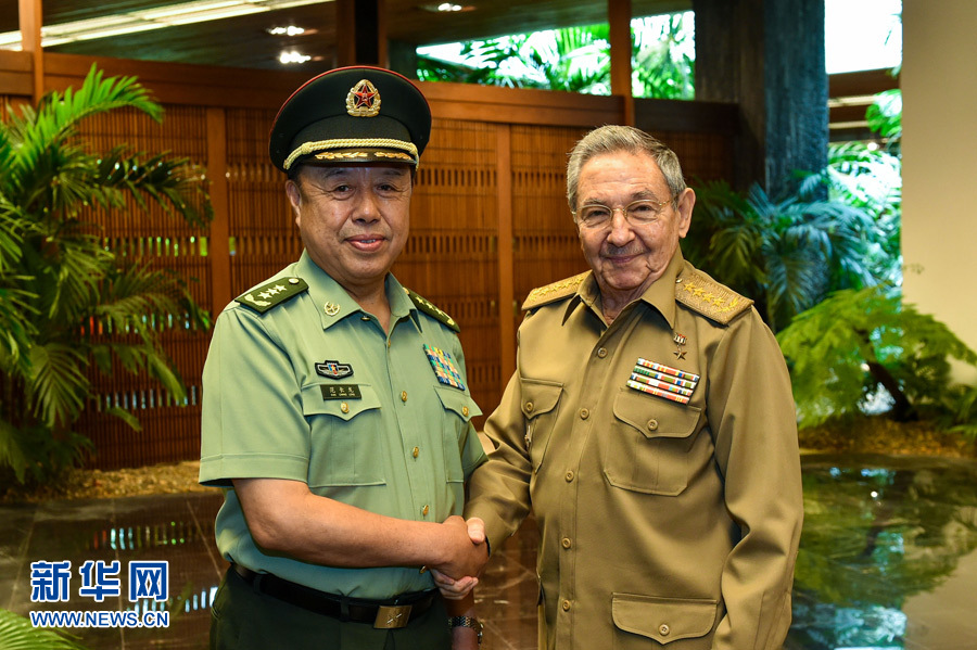 ?? 6月15日,古巴國務(wù)委員會主席兼部長會議主席勞爾·卡斯特羅(右)在首都哈瓦那會見正在古巴訪問的中央軍委副主席范長龍。 新華社發(fā)