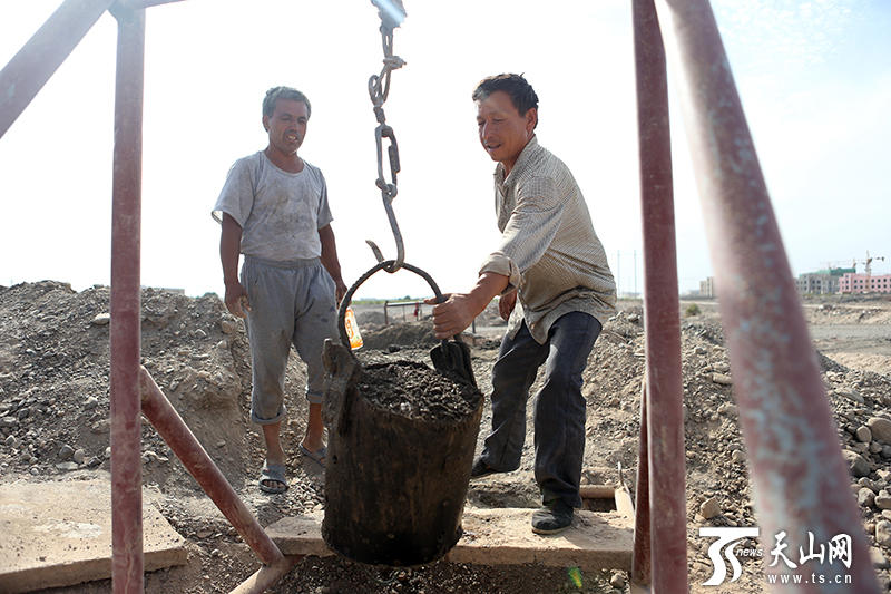 一根繩、一個桶、一輛拖拉機頭,就是庫爾班·司馬義所有的作業(yè)工具。下井時,人坐在一個T形的鐵管上,用繩索固定好,一頭連著的拖拉機緩緩開動,將繩索這頭的人吊入豎井中。大約七八分鐘后,拖拉機后退,一小桶泥沙從井里升上來,庫爾班和伙計們小心地站在井口,伸手取下桶來,將泥沙倒掉又掛在繩索上,如此重復。
