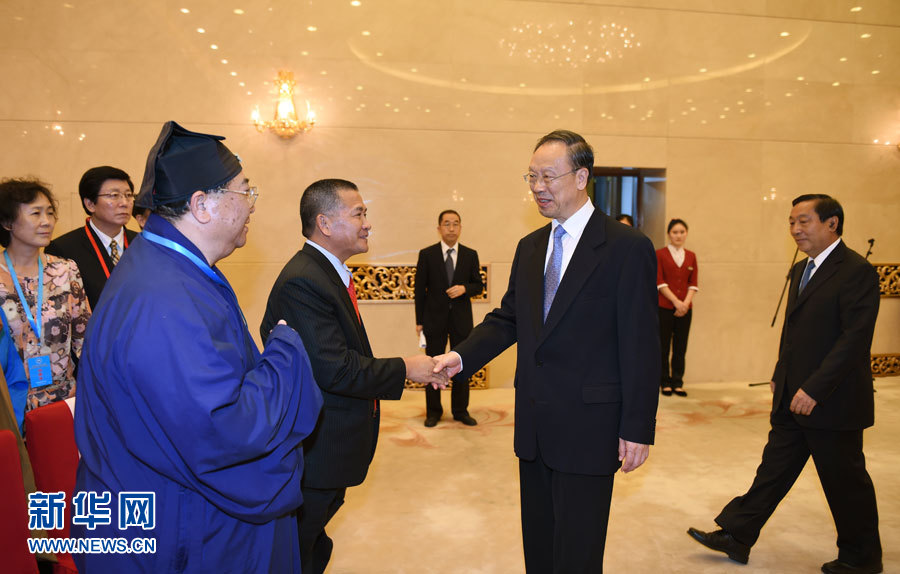 ?? 9月4日,紀(jì)念中國人民抗日戰(zhàn)爭暨世界反法西斯戰(zhàn)爭勝利70周年宗教界和平祈禱活動(dòng)在北京舉行。這是中共中央書記處書記、全國政協(xié)副主席杜青林,全國政協(xié)副主席齊續(xù)春會(huì)見參加和平祈禱活動(dòng)的宗教界代表。新華社記者 張領(lǐng) 攝