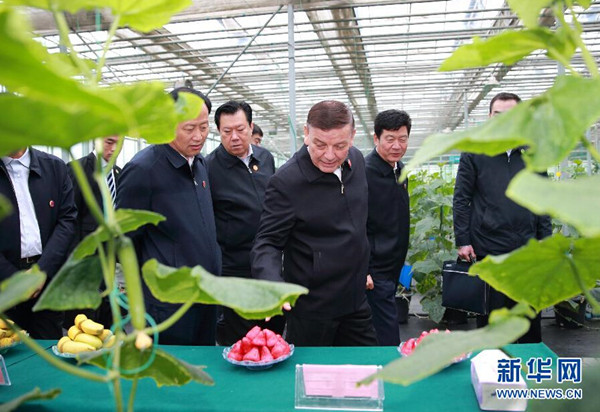 ????9月28日,全國(guó)人大常委會(huì)副委員長(zhǎng)、中央代表團(tuán)副團(tuán)長(zhǎng)艾力更·依明巴海率中央代表團(tuán)三分團(tuán)在昌吉回族自治州、烏魯木齊市看望慰問當(dāng)?shù)馗髯甯刹咳罕?。這是艾力更·依明巴海在昌吉國(guó)家農(nóng)業(yè)科技園區(qū)新疆農(nóng)業(yè)博覽園考察。新華社記者丁海濤攝