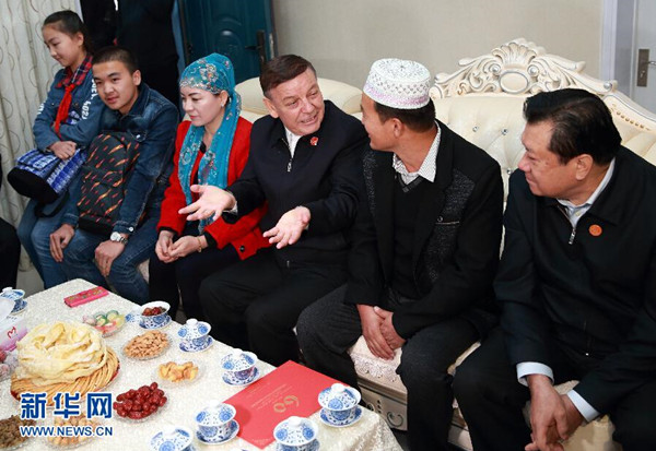 ????9月28日,全國(guó)人大常委會(huì)副委員長(zhǎng)、中央代表團(tuán)副團(tuán)長(zhǎng)艾力更·依明巴海率中央代表團(tuán)三分團(tuán)在昌吉回族自治州、烏魯木齊市看望慰問當(dāng)?shù)馗髯甯刹咳罕姟_@是艾力更·依明巴海在昌吉市榆樹溝鎮(zhèn)閔昌回民新村看望回族村民丁虎一家。新華社記者丁海濤攝