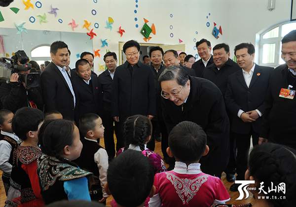 俞正聲仔細(xì)聽取新村牧民定居建設(shè)情況介紹,走進(jìn)新村幼兒園送上益智玩具等幼教器具,觀看教學(xué)點(diǎn)雙語教學(xué),與小朋友們一起拍手唱兒歌《小兔兒乖乖》,聽二年級學(xué)生朗誦童謠《我的家鄉(xiāng)也拉曼》,氣氛幸福溫暖。