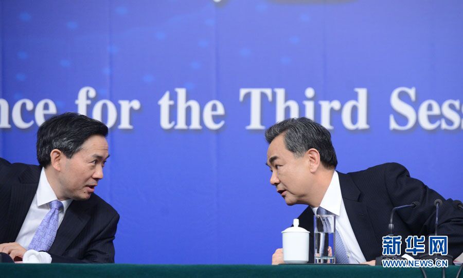 ??? 十二屆全國人大三次會議新聞中心于3月8日(星期日)10時在梅地亞中心多功能廳舉行記者會,邀請外交部部長王毅就中國的外交政策和對外關(guān)系相關(guān)問題回答中外記者提問。圖為外交部部長王毅與記者會主持人交流。新華網(wǎng)/中國政府網(wǎng) 郭小天 攝
