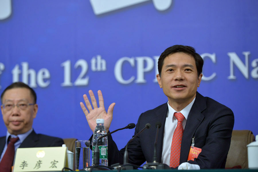 ??? 全國政協(xié)十二屆三次會(huì)議舉行記者會(huì),邀請(qǐng)全國政協(xié)常委朱維群、黃潔夫和全國政協(xié)委員胡曉義、李彥宏、俞敏洪等談促進(jìn)民生改善與社會(huì)和諧穩(wěn)定,并回答記者提問。圖為李彥宏答記者問。新華網(wǎng)/中國政府網(wǎng) 郭小天 攝