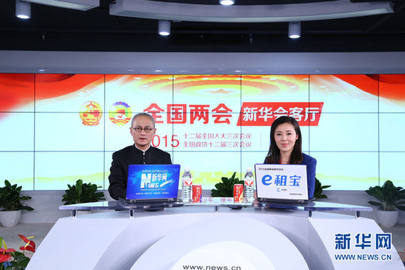??? 2015年3月14日,全國(guó)人大代表、鳳凰古城文化旅游投資股份有限公司董事長(zhǎng)葉文智做客新華會(huì)客廳,圖為嘉賓與主持人合影。新華網(wǎng) 李江??攝
