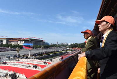 “九三閱兵”這天,李占瑞被安排在天安門城樓的第一排。雖然經(jīng)過了前兩天的車馬勞頓和活動安排,李占瑞依舊神采奕奕?!疤彀查T第一排有我的座位,還寫著我的名字。我扶著欄桿,上面下面都看見了,看的很清楚。開始是直升機(jī),有200多架,后來是戰(zhàn)斗機(jī)、轟炸機(jī)、運(yùn)輸機(jī),還有無人駕駛飛機(jī)。我都看到了。還有導(dǎo)彈,無數(shù)的導(dǎo)彈。這都是國家的國防武器,可以防止敵人侵略呀!”李占瑞爬滿褶皺的臉上閃著光。