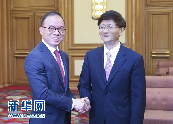 6月15日,中共中央政治局委員、中央政法委書記孟建柱在北京中南海會見香港特別行政區(qū)入境事務(wù)處處長曾國衛(wèi)。 新華社記者姚大偉攝