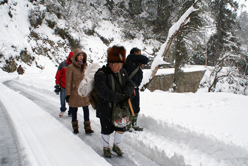 大雪封山,江德華徒步和同事們?nèi)マk案。 資料圖