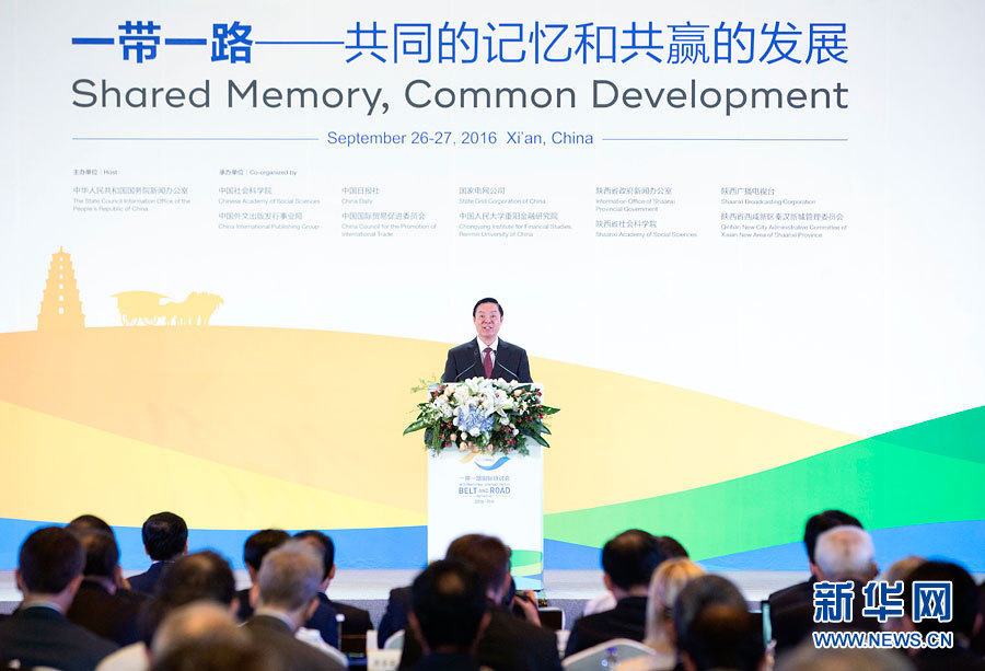 ??? 9月26日,2016“一帶一路”國際研討會在西安召開,中共中央政治局委員、中央書記處書記、中宣部部長劉奇葆出席研討會,發(fā)表題為《促進(jìn)民心相通 實現(xiàn)合作共贏》的主旨演講。新華社記者 丁林 攝