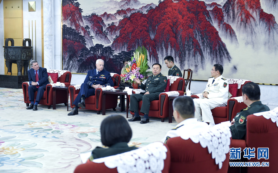10月12日,中央軍委副主席范長(zhǎng)龍?jiān)诒本?huì)見(jiàn)來(lái)華參加中澳第19次防務(wù)戰(zhàn)略磋商的澳大利亞國(guó)防軍司令賓斯金和國(guó)防部秘書(shū)長(zhǎng)理查森。新華社記者 張領(lǐng) 攝