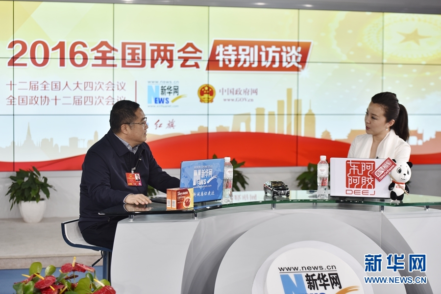 2016年3月12日,全國人大代表、正邦集團(tuán)董事局主席、總裁林印孫做客新華網(wǎng)兩會訪談直播間。圖為訪談進(jìn)行時。新華網(wǎng) 郭小天 攝