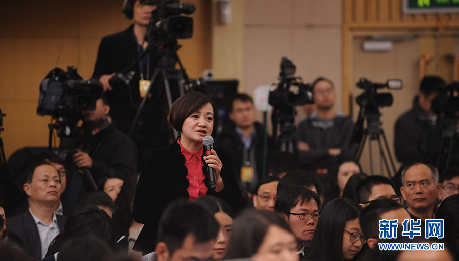 ?????十二屆全國人大四次會議新聞中心于3月12日(星期六)14時30分在梅地亞中心多功能廳舉行記者會,邀請國務(wù)院國有資產(chǎn)監(jiān)督管理委員會主任肖亞慶、副主任張喜武、副主任黃丹華和副秘書長、新聞發(fā)言人彭華崗就“國企改革”的相關(guān)問題回答中外記者的提問。圖為中央電視臺記者提問。新華網(wǎng)/中國政府網(wǎng) 陳杰 攝