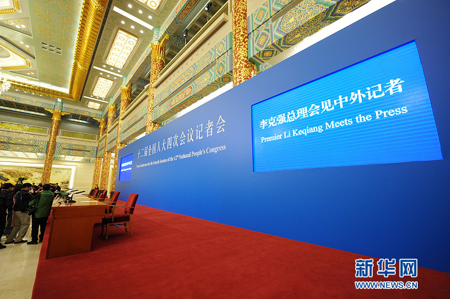 3月16日上午,國務(wù)院總理李克強在人民大會堂三樓金色大廳會見采訪十二屆全國人大四次會議的中外記者并回答記者提出的問題。圖為記者會現(xiàn)場。新華網(wǎng)/中國政府網(wǎng) 陳競超 攝