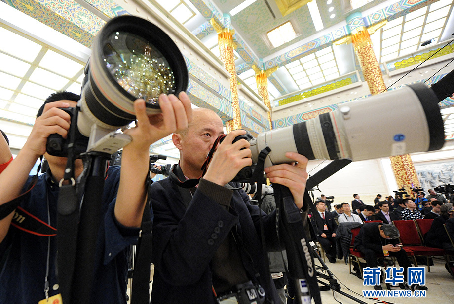 3月16日上午,國務(wù)院總理李克強(qiáng)在人民大會(huì)堂三樓金色大廳會(huì)見采訪十二屆全國人大四次會(huì)議的中外記者并回答記者提出的問題。圖為記者用多鏡頭拍攝記者會(huì)。新華網(wǎng)/中國政府網(wǎng) 陳競(jìng)超 攝