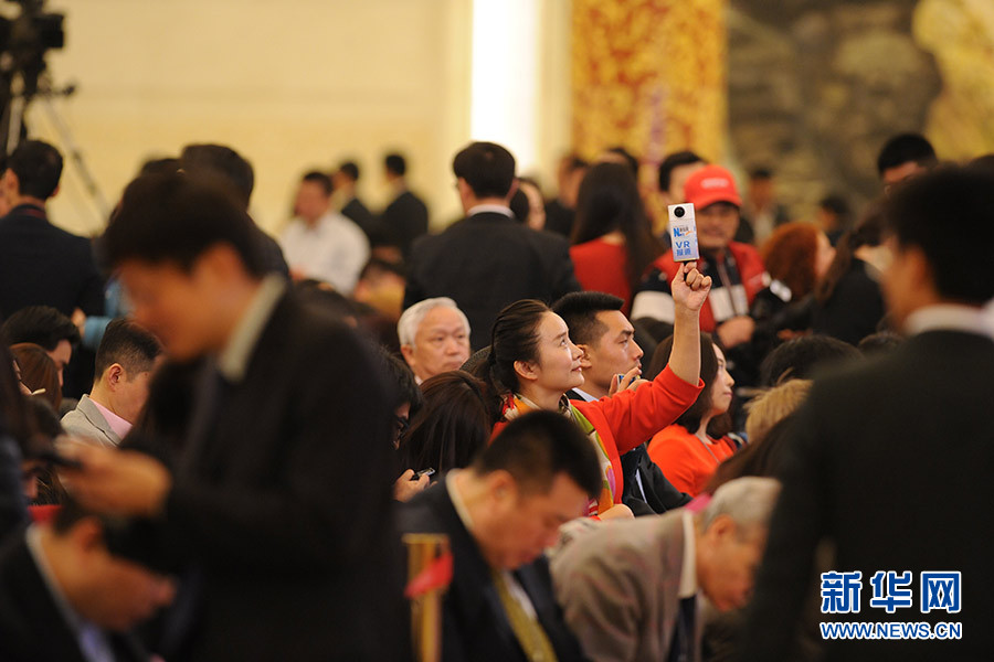 3月16日上午,國務(wù)院總理李克強(qiáng)在人民大會(huì)堂三樓金色大廳會(huì)見采訪十二屆全國人大四次會(huì)議的中外記者并回答記者提出的問題。圖為新華網(wǎng)VR報(bào)道總理記者會(huì)。新華網(wǎng)/中國政府網(wǎng) 陳杰攝