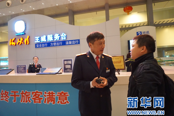 春運(yùn)期間,火車站客流量陡增,在擁擠的人潮中,藏藍(lán)色的身影會(huì)讓旅客的內(nèi)心平添一份安定?!澳茫?qǐng)問(wèn)有什么可以幫您”,“您這趟車快到檢票時(shí)間了,2號(hào)進(jìn)站口人稍微少一點(diǎn)”,“退票請(qǐng)帶身份證到5號(hào)窗口”。兩小時(shí)下來(lái),這樣的話王威重復(fù)了成百上千次,手上水杯里的水卻幾乎未少。