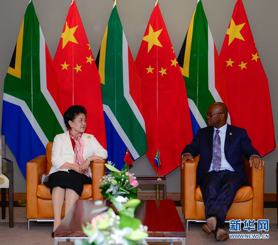 4月24日,中國國務(wù)院副總理劉延?xùn)|(左)在南非比勒陀利亞會(huì)見南非藝術(shù)和文化部部長、中南高級(jí)別人文交流機(jī)制南方委員會(huì)主席姆特特瓦。新華社記者翟健嵐攝