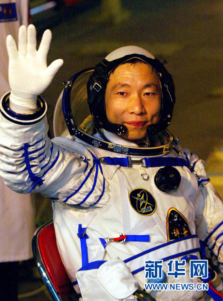 執(zhí)行中國首次載人航天飛行任務的航天員楊利偉出發(fā)登艙前揮手致意(資料照片)。新華社發(fā)