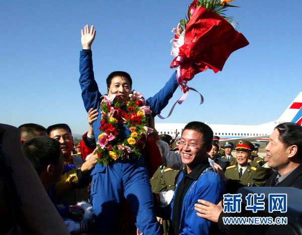 經(jīng)歷21小時23分鐘的飛行后,楊利偉從天上歸來,中華民族千年飛天夢圓。