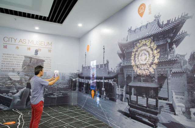 8月1日,呼和浩特玉泉區(qū)大數(shù)據(jù)應(yīng)用產(chǎn)業(yè)基地的工作人員通過(guò)平板設(shè)備展示城市博物館AR體驗(yàn)墻。新華社發(fā) 丁根厚 攝