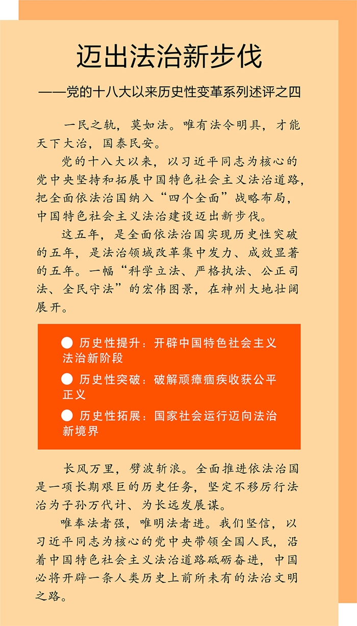 這五年,是全面依法治國(guó)實(shí)現(xiàn)歷史性突破的五年,是法治領(lǐng)域改革集中發(fā)力、成效顯著的五年。一幅“科學(xué)立法、嚴(yán)格執(zhí)法、公正司法、全民守法”的宏偉圖景,在神州大地壯闊展開。