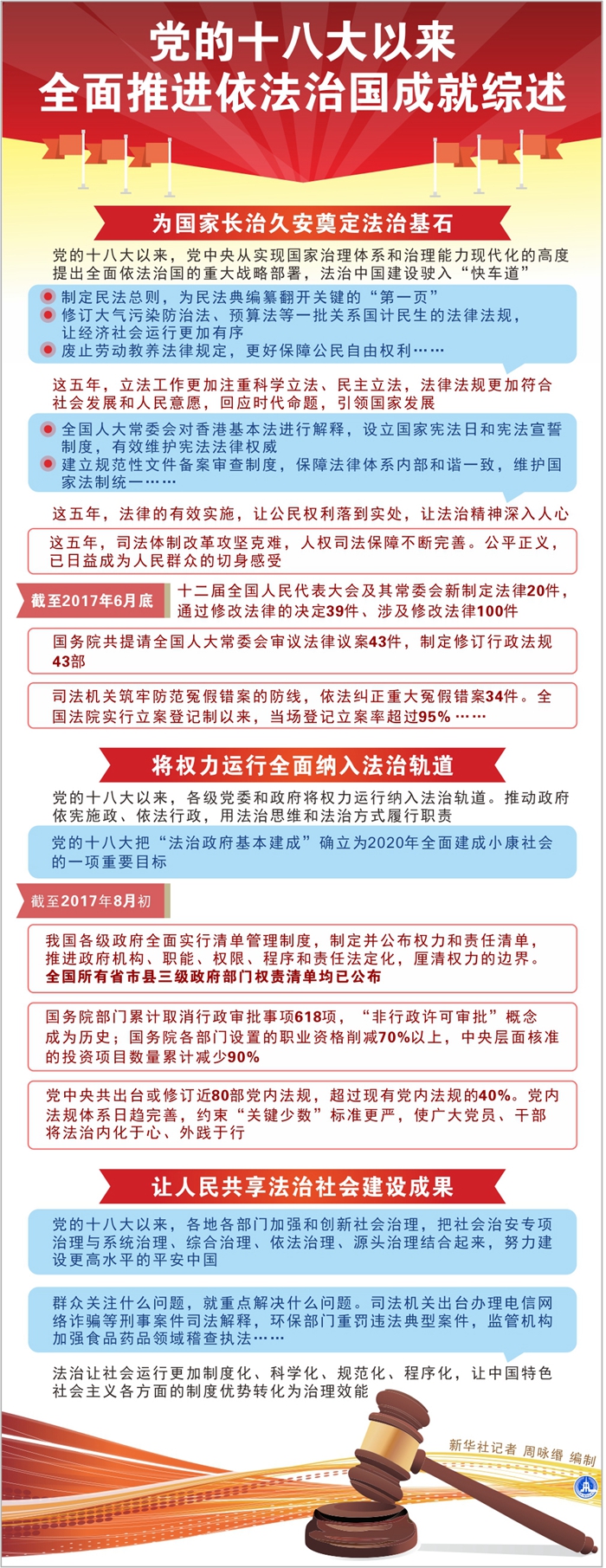 從修改立法法賦予所有設(shè)區(qū)的市地方立法權(quán),到加強(qiáng)規(guī)范性文件違憲違法備案審查;從發(fā)布法治政府建設(shè)實(shí)施綱要,到司法體制改革“猛藥去疴”;從依法懲治腐敗推進(jìn)全面從嚴(yán)治黨,到依法治軍、從嚴(yán)治軍……五年來,改革發(fā)展穩(wěn)定、內(nèi)政外交國(guó)防、治黨治國(guó)治軍,由法治作保障、靠法治來推進(jìn)。