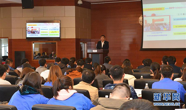 在國網(wǎng)天津?yàn)I海公司,張黎明在“十九大代表與國資系統(tǒng)青年面對面宣講會”上宣講十九大精神(11月10日攝)。 新華社發(fā)