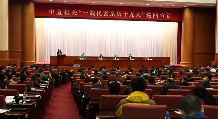 新華網(wǎng)北京11月14日電 11月14日,中直工委在京舉行中直機(jī)關(guān)“一線代表親歷十九大”巡回宣講首場報告會,來自中直機(jī)關(guān)工作第一線的黨的十九大代表進(jìn)行了宣講。中直機(jī)關(guān)300多名青年干部職工參加。