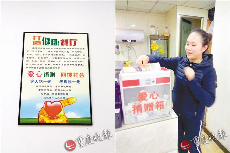 抄手店的店規(guī)(左)。老板張德蓉當(dāng)面存入捐款箱,有些顧客會額外多捐(右)。