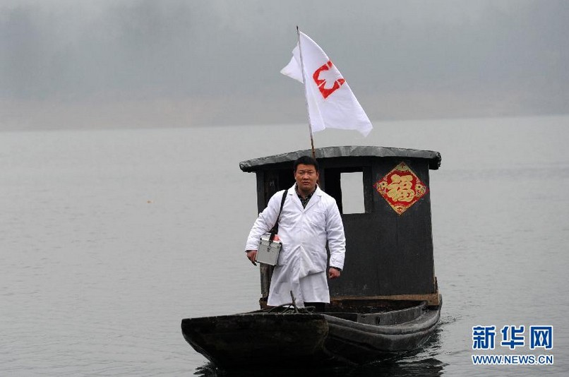 海島的東島岸邊,常年停靠著一個(gè)船屋,外面掛著“麻埠鎮(zhèn)齊山村海島衛(wèi)生站”的牌子。39歲的余家軍是船屋的主人,1999年衛(wèi)校畢業(yè)后回到齊山村,和妻子吳起嬌把家安到了船上,取名“海島衛(wèi)生站”,他也成了這里唯一的村醫(yī)。18年里,不論是白天黑夜、刮風(fēng)下雨甚至下雪,余家軍都劃著一條小木船,每日來往于東西兩島之間,為200多名村民看病,這條木船也被村民們親切地稱為“水上120”。