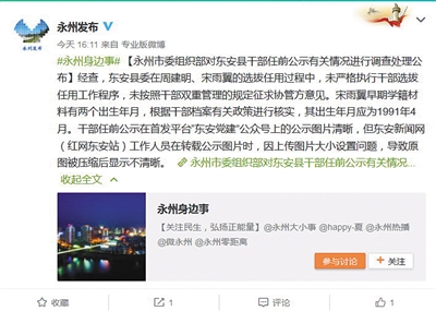 昨日,永州市委組織部通報事件調(diào)查結(jié)果稱,經(jīng)查,東安縣委在周建明、宋雨翼的選拔任用過程中,未嚴(yán)格執(zhí)行干部選拔任用工作程序,未按照干部雙重管理的規(guī)定征求協(xié)管方意見。其中,宋雨翼早期學(xué)籍材料有兩個出生年月,根據(jù)干部檔案有關(guān)政策進行核實,其出生年月應(yīng)為1991年4月。此外,關(guān)于此前公示圖片不清晰的問題,調(diào)查結(jié)果稱,干部任前公示在首發(fā)平臺“東安黨建”公眾號上的公示圖片清晰,但東安新聞網(wǎng)(紅網(wǎng)東安站)工作人員在轉(zhuǎn)載公示圖片時,因上傳圖片大小設(shè)置問題,導(dǎo)致原圖被壓縮后顯示不清晰。
