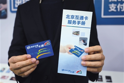 昨日,工作人員在展示京津冀互通卡?;ネ嬗疑辖怯∮小敖煌?lián)合”標識。 北京市政交通一卡通有限公司供圖