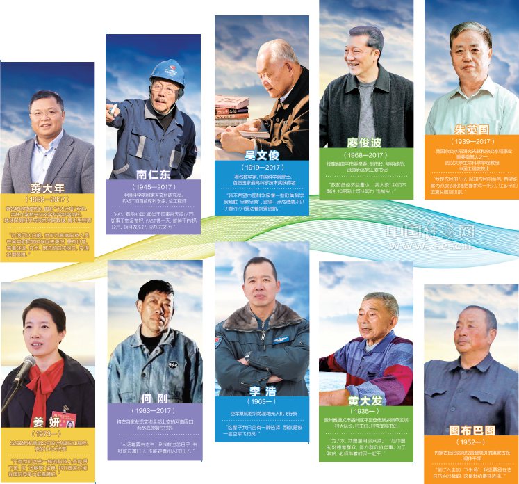 回首2017年,我國各行各業(yè)涌現(xiàn)出一批有理想情懷、有人格魅力、有卓越言行的時(shí)代先鋒。這當(dāng)中,有先后3次將自家挖出的國家級(jí)文物上交故宮博物院的普通農(nóng)民,也有帶領(lǐng)當(dāng)?shù)厝罕娪?0年的時(shí)間在懸崖峭壁上鑿出近10公里長“生命渠”的老支書,還有為了中國天文事業(yè)拄著竹竿、翻山越嶺踏遍貴州大山所有洼地為射電望遠(yuǎn)鏡選址的“天眼之父”。