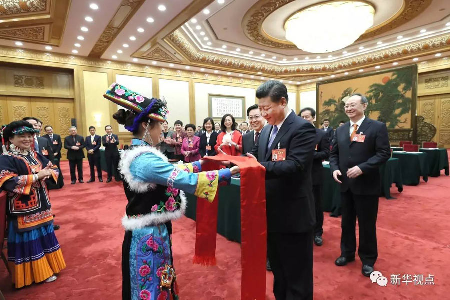 四川是一個多民族聚居的省份。習(xí)近平走進(jìn)會場時,身著民族服裝的藏族、彝族、羌族代表向總書記問好。藏族、羌族代表分別獻(xiàn)上了潔白的哈達(dá)和鮮艷的羌紅,表達(dá)對總書記的敬意,祝福中華民族繁榮昌盛。習(xí)近平請他們轉(zhuǎn)達(dá)對各族同胞的祝福。