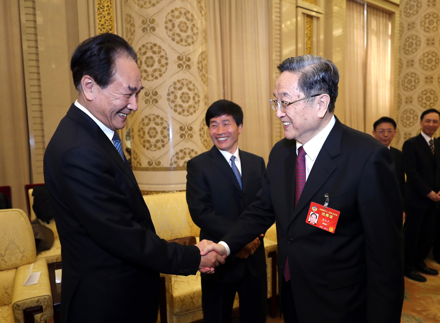 ??? 3月13日,中共中央政治局常委、全國(guó)政協(xié)主席俞正聲在北京人民大會(huì)堂看望參加全國(guó)政協(xié)十二屆五次會(huì)議新聞報(bào)道工作的中央主要新聞媒體負(fù)責(zé)同志和記者代表,向參加大會(huì)報(bào)道的新聞工作者表示誠(chéng)摯慰問(wèn)和衷心感謝。這是俞正聲與新華社社長(zhǎng)蔡名照握手。新華社記者 鞠鵬 攝