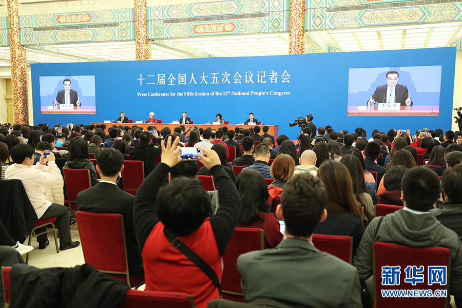 3月15日上午,國(guó)務(wù)院總理李克強(qiáng)在人民大會(huì)堂三樓金色大廳會(huì)見采訪十二屆全國(guó)人大五次會(huì)議的中外記者并回答記者提出的問題。圖為記者會(huì)正在進(jìn)行。新華網(wǎng)/中國(guó)政府網(wǎng) 翟子赫 攝?