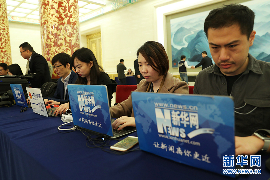 3月15日上午,國務院總理李克強在人民大會堂三樓金色大廳會見采訪十二屆全國人大五次會議的中外記者并回答記者提出的問題。圖為新華網(wǎng)記者在做直播準備。新華網(wǎng)/中國政府網(wǎng) 翟子赫 攝