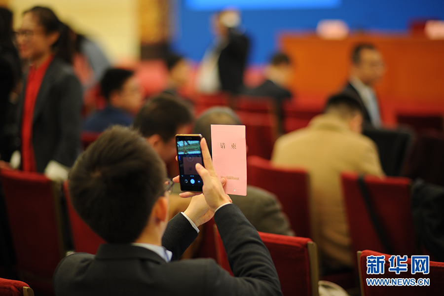 3月15日上午,國務(wù)院總理李克強在人民大會堂三樓金色大廳會見采訪十二屆全國人大五次會議的中外記者并回答記者提出的問題。圖為在記者會現(xiàn)場等待的記者。新華網(wǎng)/中國政府網(wǎng) 翟子赫 攝
