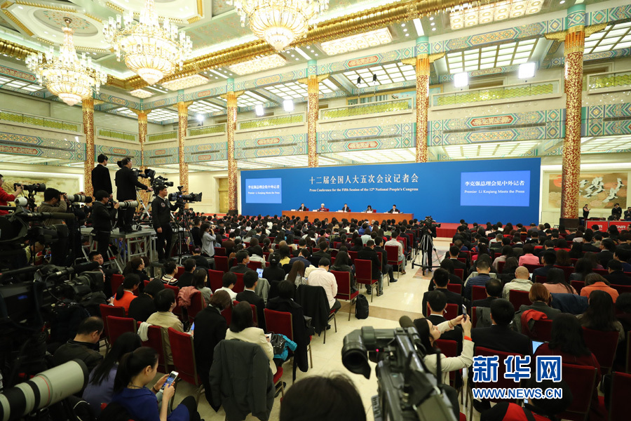 3月15日上午,國務院總理李克強在人民大會堂三樓金色大廳會見采訪十二屆全國人大五次會議的中外記者并回答記者提出的問題。圖為記者會現(xiàn)場。新華網/中國政府網 翟子赫 攝?