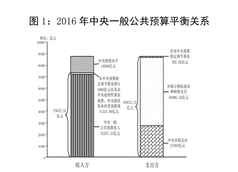 中央一般公共預算收入72357.31億元,為調整預算的100%,比2015年同口徑增長1.2%。加上從中央預算穩(wěn)定調節(jié)基金調入1000億元,從中央政府性基金預算、中央國有資本經(jīng)營預算調入315.06億元,收入總量為73672.37億元。中央一般公共預算支出86890.35億元(其中,中央本級支出27404億元,中央對地方稅收返還和轉移支付59486.35億元),完成調整預算的99.1%,增長4.5%。加上補充中央預算穩(wěn)定調節(jié)基金782.02億元,支出總量為87672.37億元。收支總量相抵,中央財政赤字14000億元,與預算持平。2016年中央預備費預算500億元,實際支出146.1億元,剩余353.9億元全部轉入中央預算穩(wěn)定調節(jié)基金。2016年末,中央財政國債余額120066.75億元,控制在年度預算限額125908.35億元以內;中央預算穩(wěn)定調節(jié)基金余額2678.06億元(含通過收回中央財政結轉資金補充1501.83億元)。
