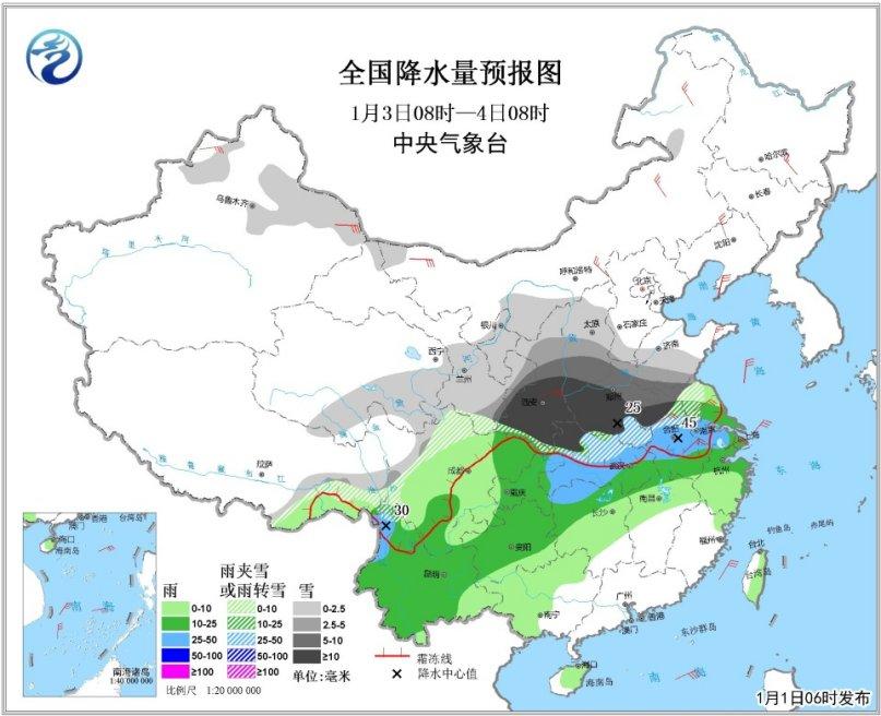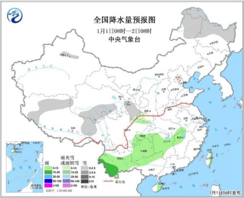2日08時至3日08時,中東部有大范圍雨雪天氣。西藏東部、青海東部和南部、西北地區(qū)東部、華北南部、黃淮大部等地有小到中雪或雨夾雪;西南地區(qū)大部、江漢、黃淮東南部、江淮、江南北部、廣西西部等地有小到中雨,其中云南西南部的部分地區(qū)有大雨;內(nèi)蒙古中西部、遼東半島、黃淮東部、江淮東部等地有4~6級風(fēng)。南海東部有6~8級、陣風(fēng)9~10級大風(fēng)。