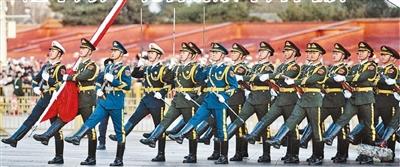 7時(shí)33分,編隊(duì)走出金水橋,齊步換正步行進(jìn)。3名分隊(duì)長(zhǎng)拔刀出鞘,行舉刀禮。同一時(shí)間,90名隊(duì)員由肩槍換為端槍,威武前行。