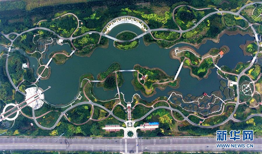 俯瞰天津濱海新區(qū)臨港經(jīng)濟區(qū)的臨港生態(tài)濕地公園(2016年10月21日攝)。臨港生態(tài)濕地公園多年來對工業(yè)區(qū)內(nèi)的污水和雨水進行凈化處理和循環(huán)利用,污水經(jīng)二次處理達到1級A標準,用于綠植灌溉等市政用水,減少污染物入海。新華社記者 岳月偉 攝