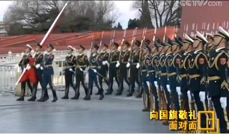 董世偉:向國旗是由我喊,敬禮是由三個(gè)分隊(duì)長同時(shí)喊,因?yàn)橹虚g有間隔,所以這個(gè)口令很難卡到一塊去,這需要不斷磨合,這十幾天的時(shí)間我們粗略統(tǒng)計(jì)一下,大概練了得有2000多次。