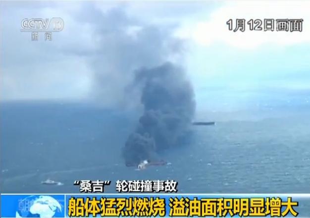 昨天(12日),央視記者登上國家海洋局海監(jiān)飛機,在空中勘察“桑吉”輪碰撞事故現(xiàn)場。記者發(fā)現(xiàn),桑吉輪船身猛烈燃燒,溢油情況比前兩天明顯增多,火勢已經(jīng)蔓延到海面,桑吉輪船體傾斜嚴重,非常脆弱。
