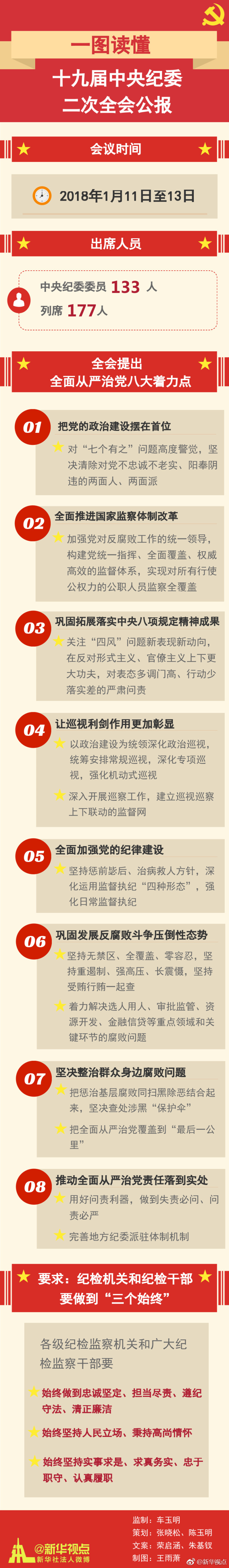 新華網(wǎng)北京1月13日電 13日審議通過(guò)的十九屆中央紀(jì)委二次全會(huì)公報(bào)新鮮出爐。想知道全面從嚴(yán)治黨如何發(fā)力?有這張圖在手,重點(diǎn)、亮點(diǎn)、焦點(diǎn)你都擁有?。〒?jù)“新華視點(diǎn)”微博報(bào)道)
