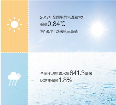 2017年,全國平均氣溫較常年偏高0.84℃,為1951年以來第三高值;四季氣溫均偏高,其中冬季為歷史同期最高。全國平均年降水量641.3毫米,比常年偏多1.8%。